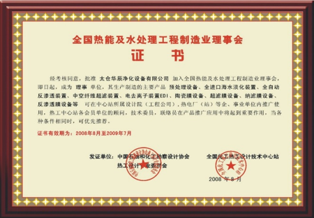 全國熱能及水處理工程制造業理事會證書